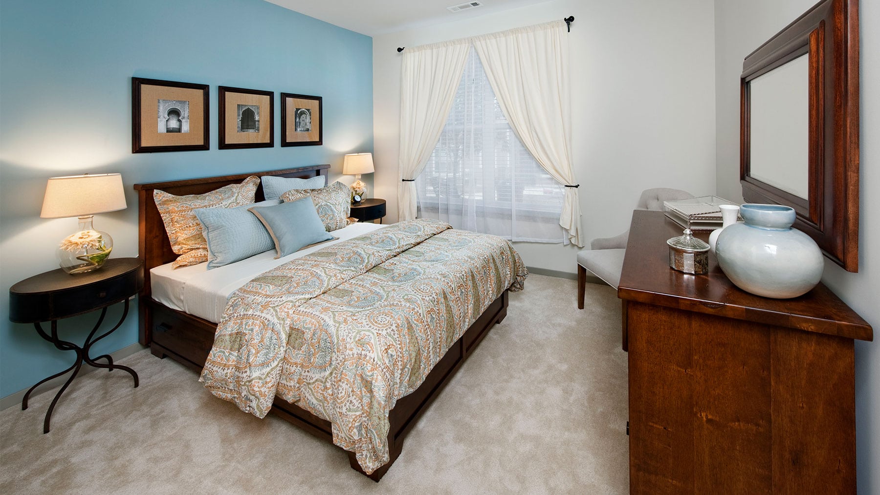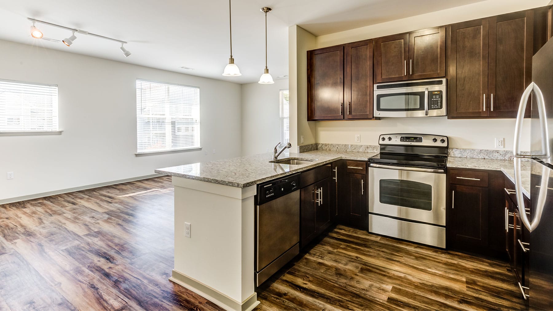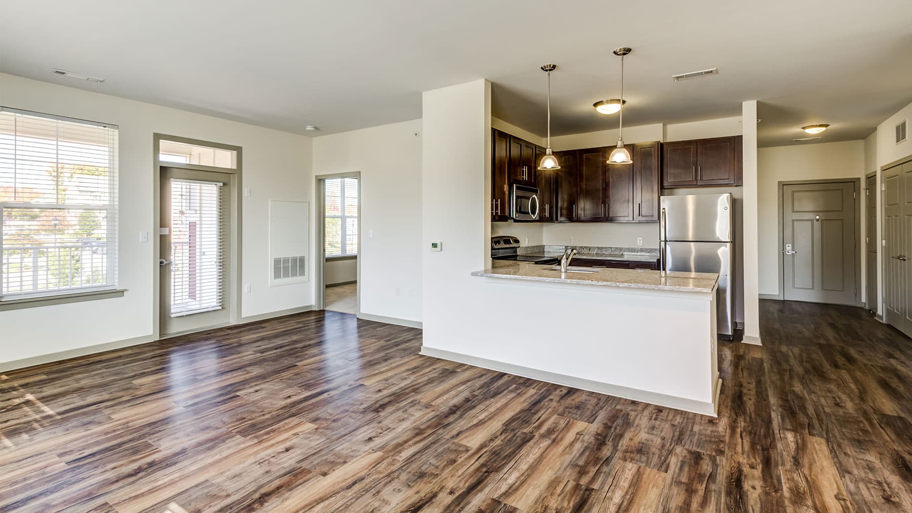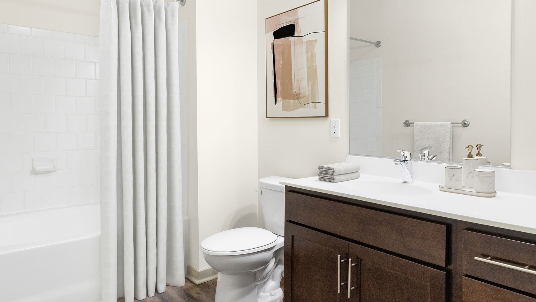 Apartment bathroom with dark wood vanity