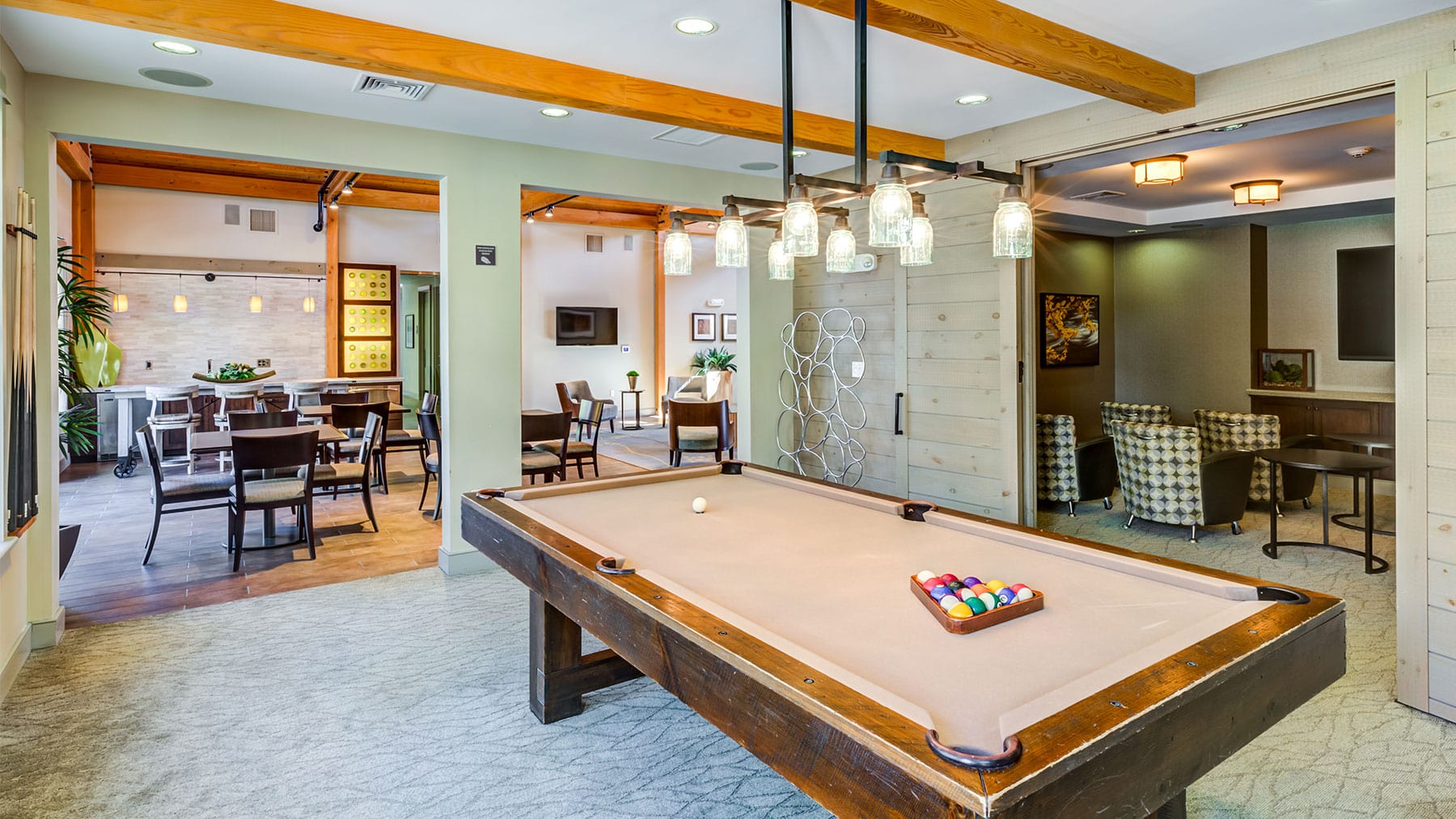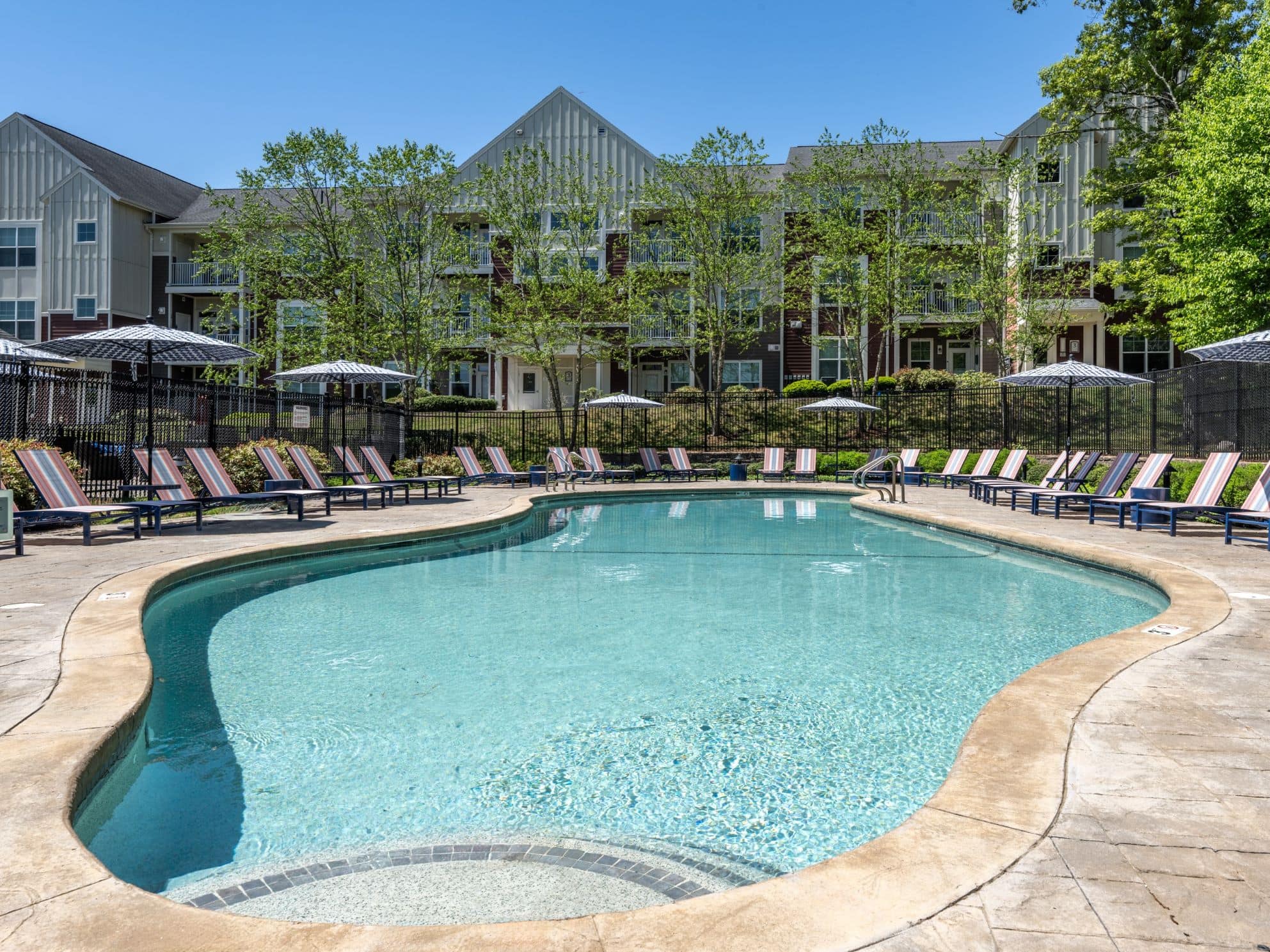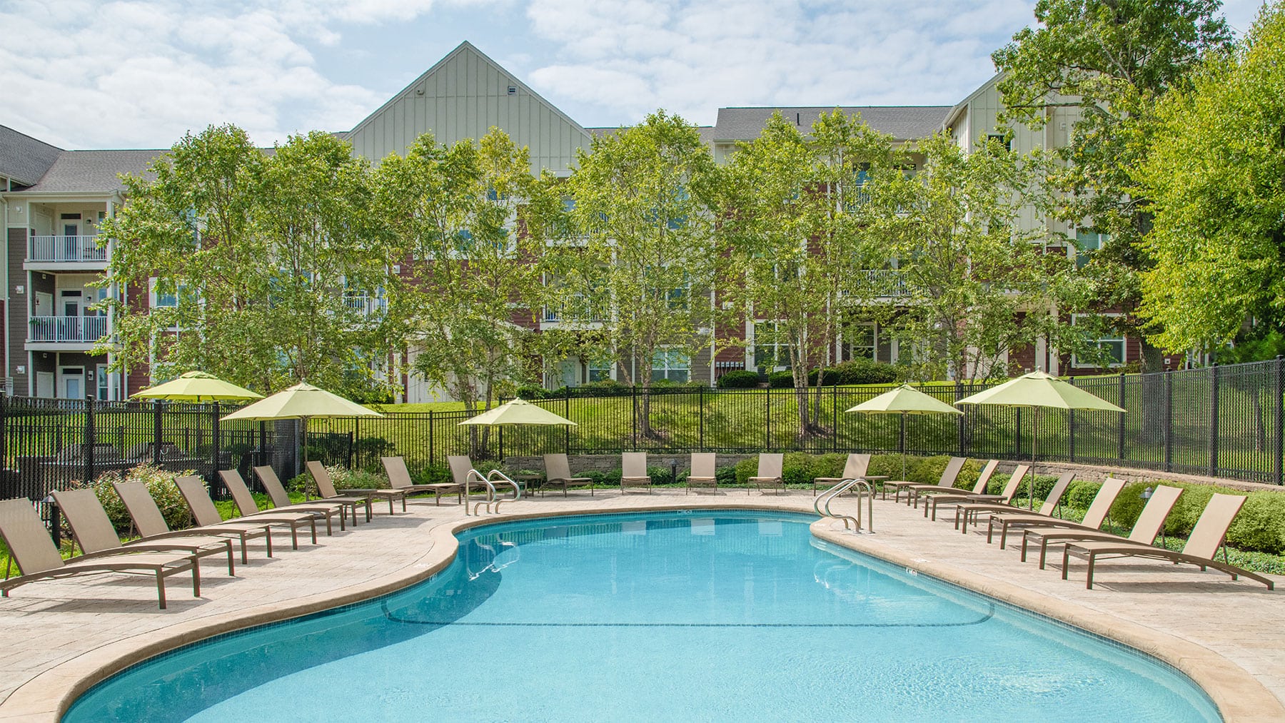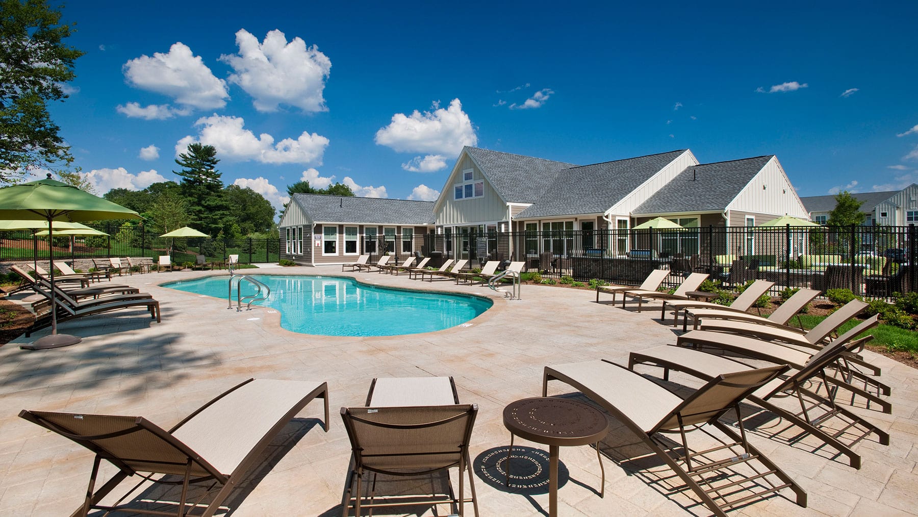 Aerial view of apartment pool area with clubhouse