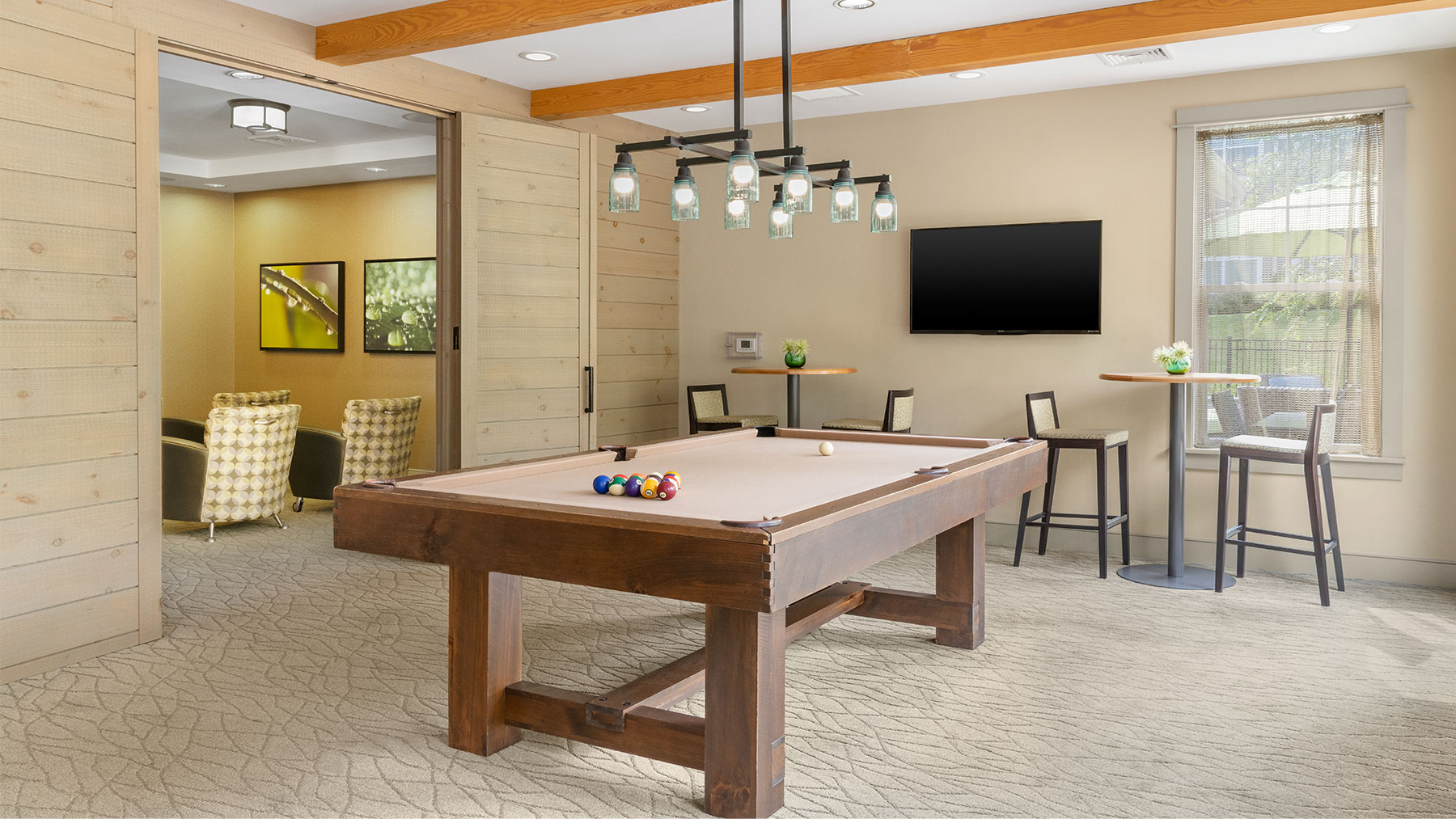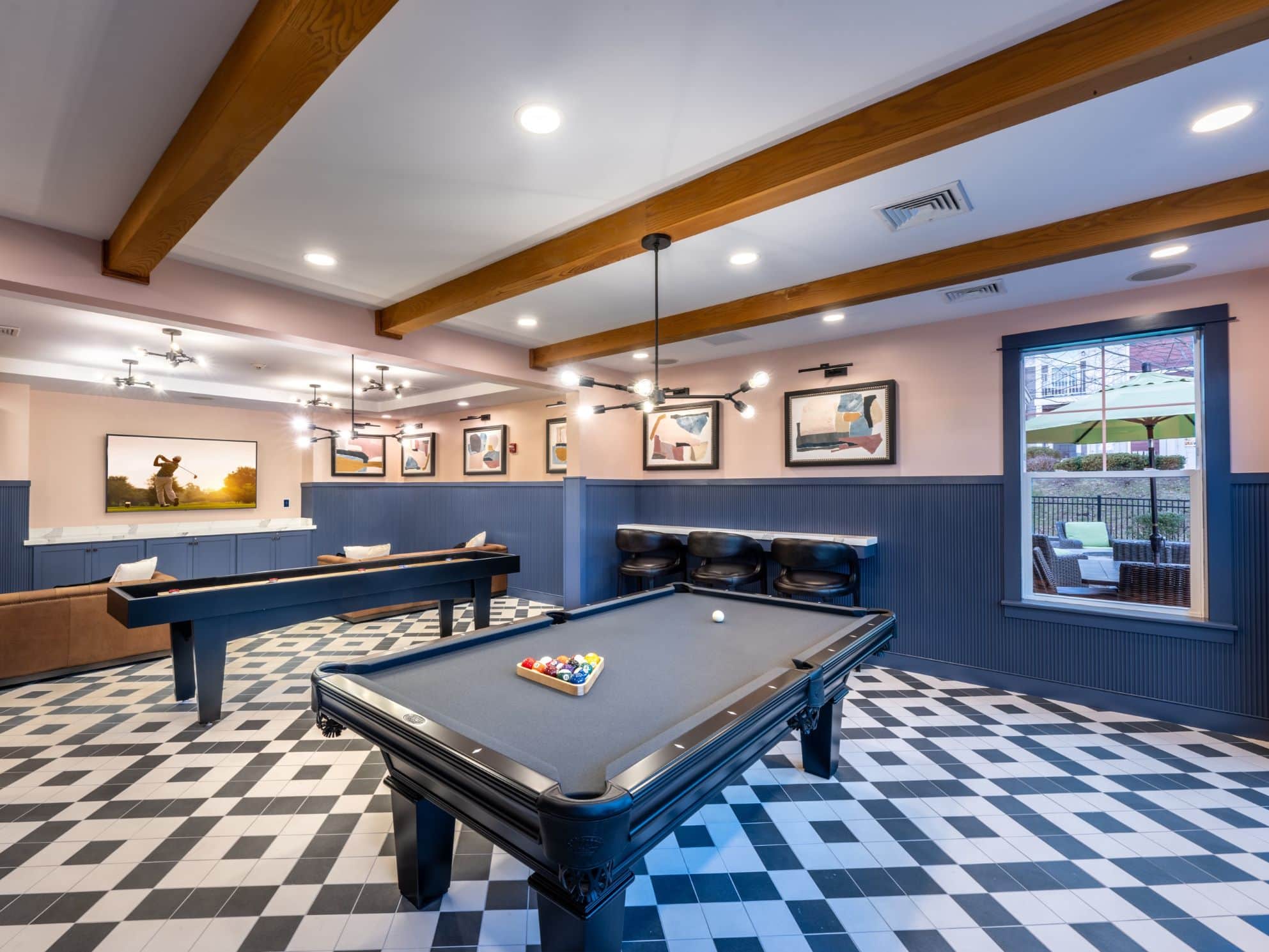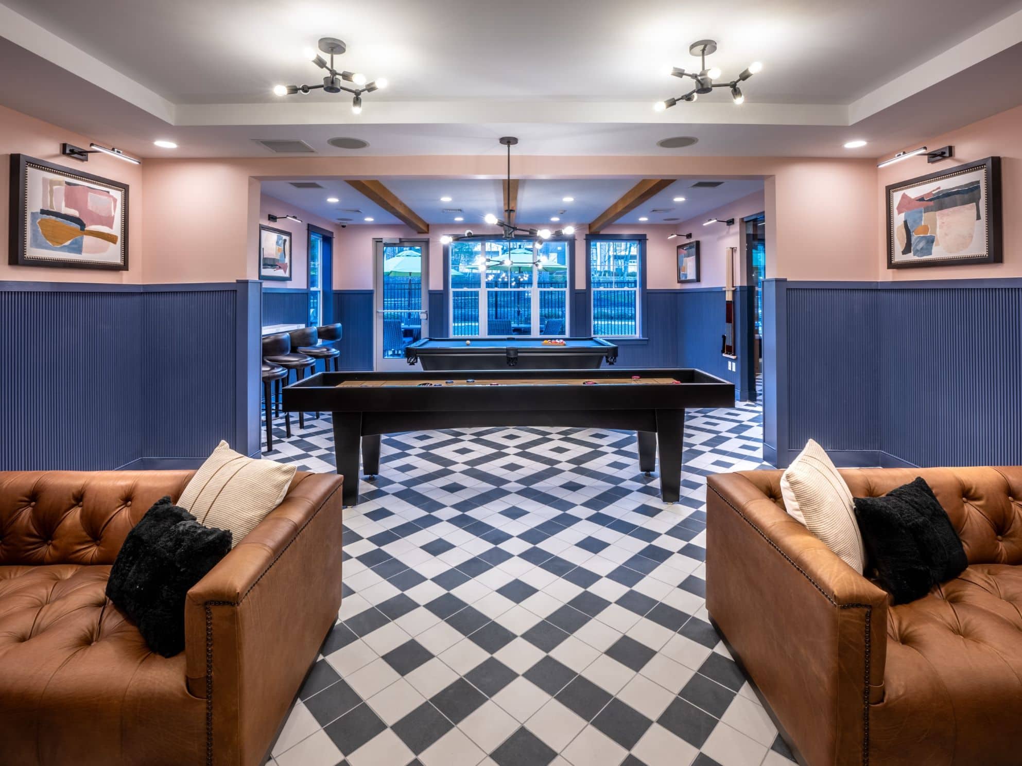 Aerial view of apartment pool area with clubhouse
