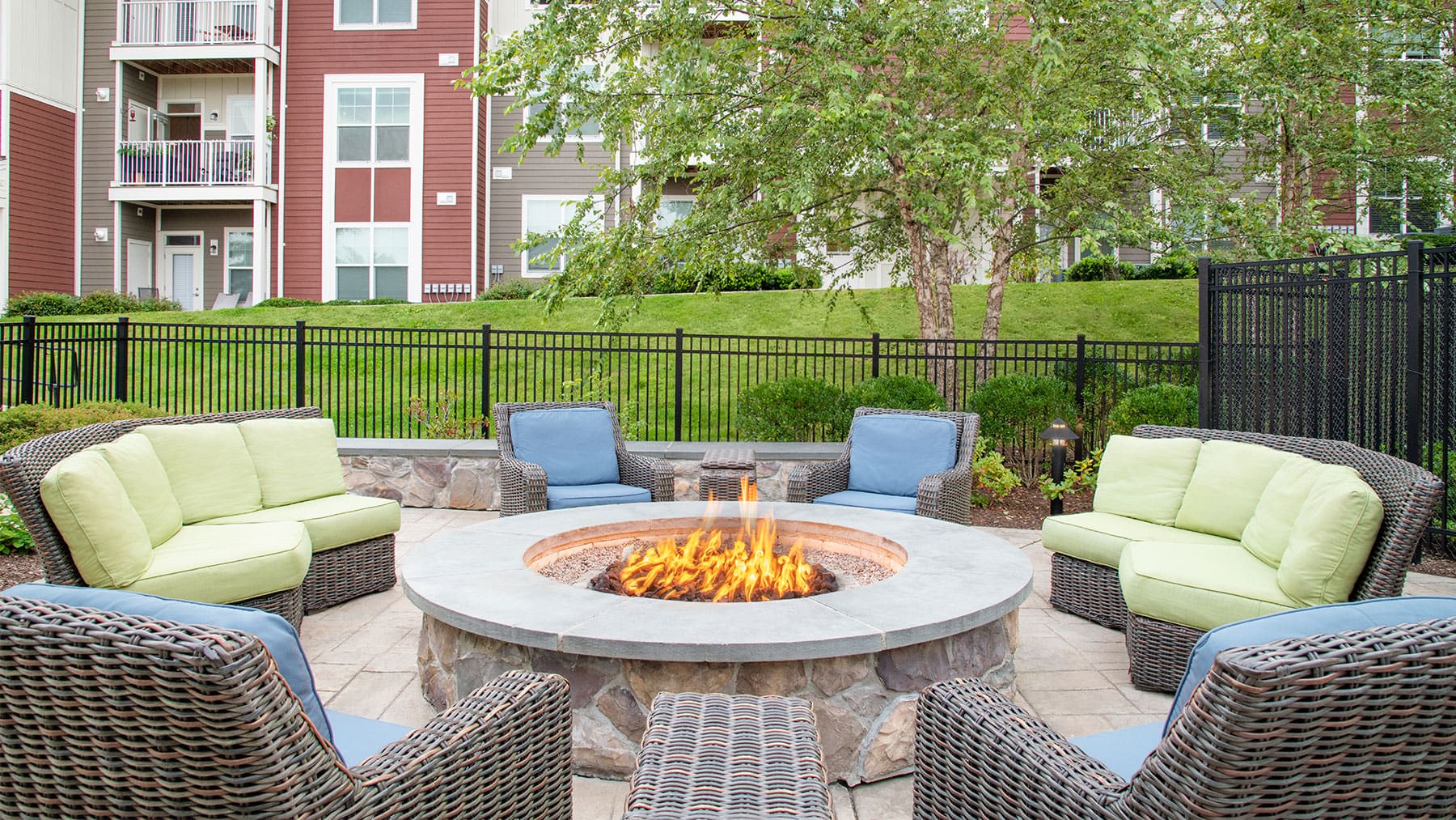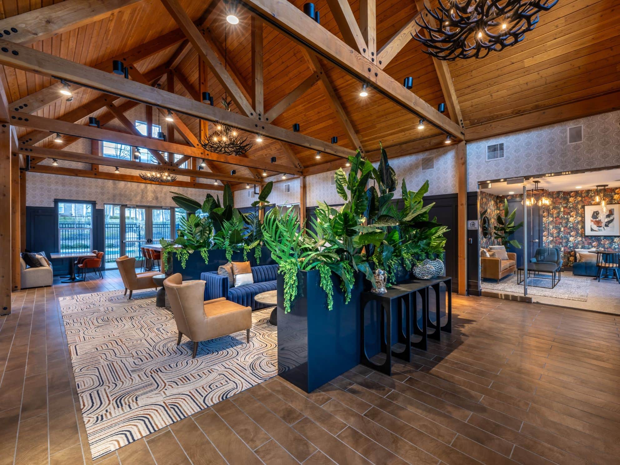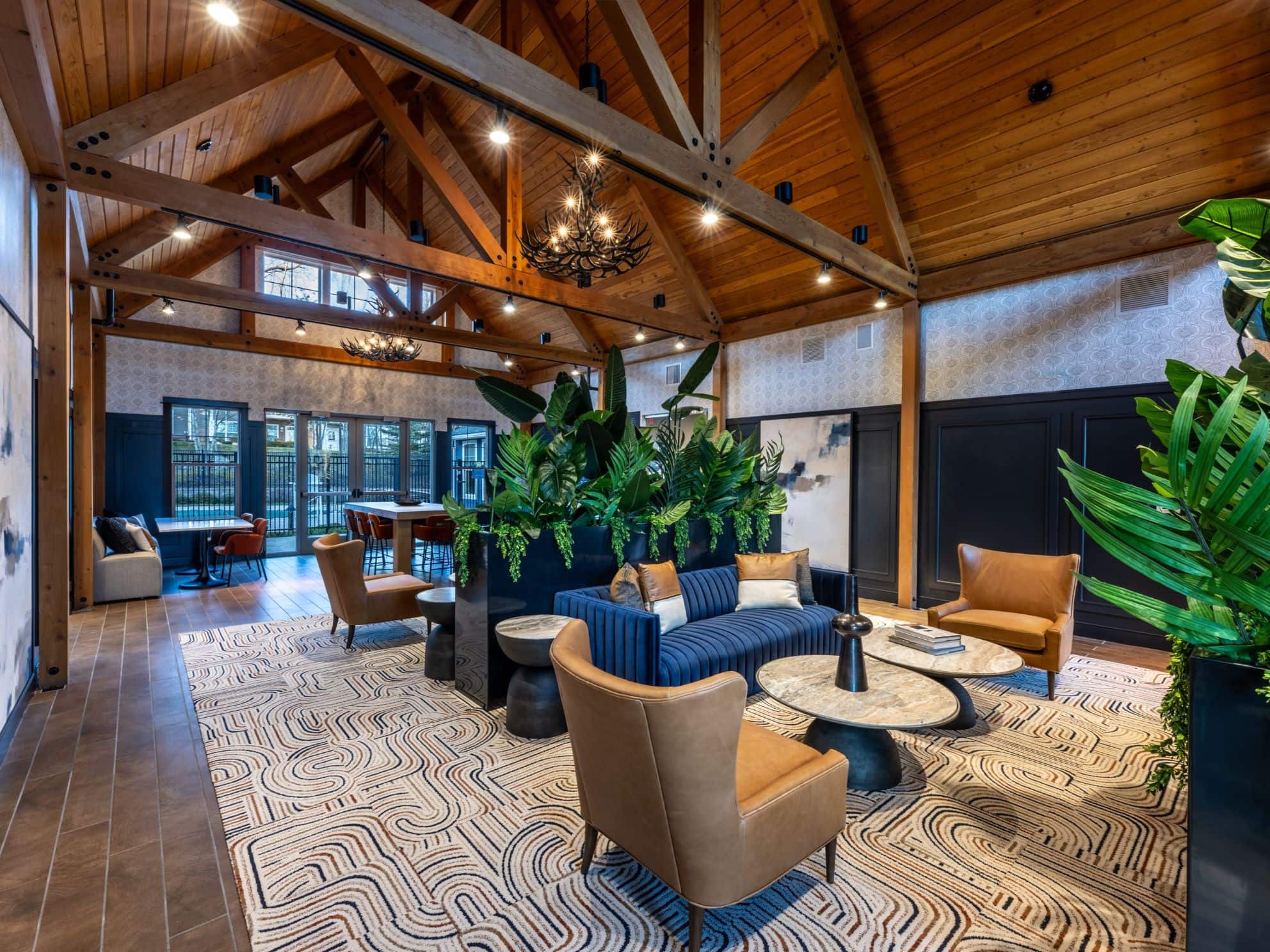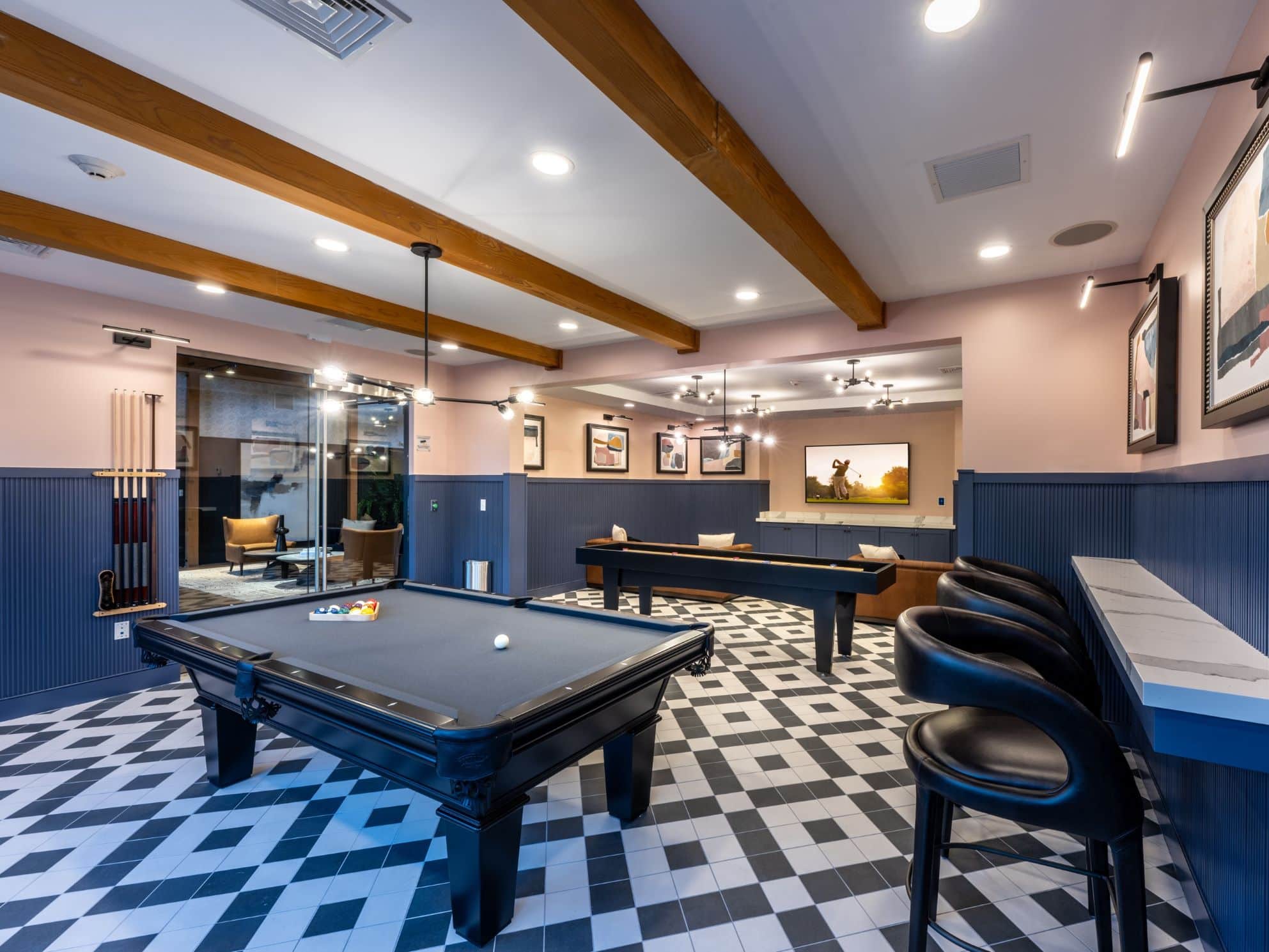 Aerial view of apartment pool area with clubhouse